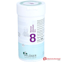 Biochemie Pflüger Nr. 8 Natrium chloratum D 6 Verreibung zum Einnehmen. Anwendungsgebiete: Registriertes homöopathisches Arzneimittel, daher ohne Angabe einer therapeutischen Indikation.