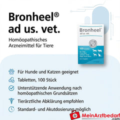 Bronheel ad us. vet. ist ein registriertes homöopathisches Arzneimittel für Hunde und Katzen in Tablettenform. Es dient der unterstützenden Anwendung nach homöopathischen Grundsätzen; eine genaue tierärztliche Abklärung sollte vor Anwendung erfolgen.