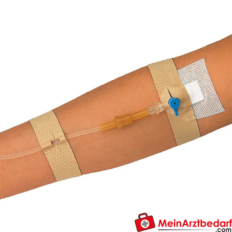 Die Fixierung von Infusionskanülen unterschiedlicher Art sowie deren Zuführungsschläuchen wird mit diesem Produkt ermöglicht.