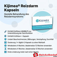 Die Kijimea® Reizdarm Kapseln enthalten den probiotischen Bakterienstamm B.bifidum MIMBb75 und sind zur Unterstützung bei Symptomen des Reizdarmsyndroms wie Bauchschmerzen, Blähungen, aufgeblähtem Bauch, Verstopfung oder Durchfall bestimmt. Medizinisch sachlich formuliert begleiten sie die Wiederherstellung einer ausgeglichenen Darmfunktion.