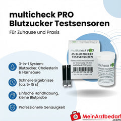 Lieferumfang: 50 Stk. multicheck PRO Blutzucker-Testsensoren (2×25 Stk.), 25 Stk. multicheck PRO Cholesterin-Testsensoren und 25 Stk. multicheck PRO Harnsäure-Testsensoren, jeweils Testsensoren für multicheck PRO Messgeräte.