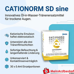 Cationorm SD sine ist ein kationisches Öl-in-Wasser-Tränenersatzmittel zur Linderung trockener Augen. Die positiv geladenen Lipidtröpfchen haften an der Augenoberfläche, unterstützen alle drei Schichten des Tränenfilms und sorgen für sofortige Benetzung und anhaltenden Schutz.