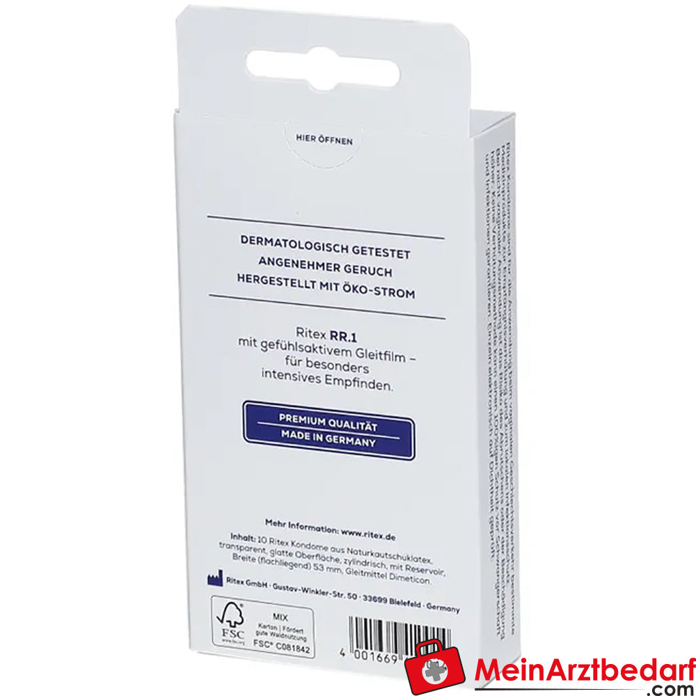 Das Ritex RR.1 Kondom bietet ein hauchzartes Gefühl und ist für Paare geeignet, die intensivere Empfindungen bei sicherer Anwendung wünschen. Leicht abrollbar mit zylindrischem Design und Reservoir; einzeln auf Dichtheit geprüft und dermatologisch getestet.