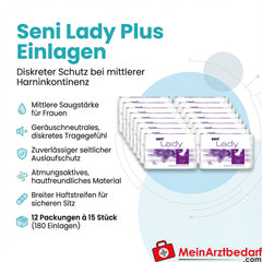 Seni Lady Plus Einlagen wurden für Frauen mit mittlerer Harninkontinenz entwickelt und bieten dezente Absorption bei Alltagstätigkeiten. Die Einlagen sind geräuschneutral, atmungsaktiv und verfügen über seitlichen Auslaufschutz sowie einen breiten Haftstreifen für sicheren Sitz in Damenunterwäsche.