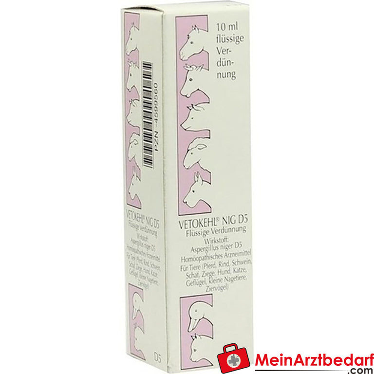 Vetokehl Nig D5 vet ist ein homöopathisches Arzneimittel in Tropfenform zur unterstützenden Anwendung bei Tieren. Geeignet für Nutztiere, Nagetiere, Vögel, Hunde und Katzen. Praktische 10-ml-Flasche für die veterinärmedizinische Anwendung.