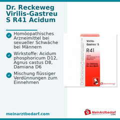 Virilis-Gastreu S R41, Mischung flüssiger Verdünnungen. Anwendungsgebiete: Die Anwendungsgebiete leiten sich von den homöopathischen Arzneimittelbildern ab. Dazu gehören: Sexuelle Schwäche bei Männern. Warnhinweis: Dieses Arzneimittel enthält 37 Vol.-% Alkohol.