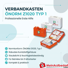 Standard-compliant first aid kit in accordance with ÖNORM Z1020, type 1, in a robust plastic case. Compact and weather-resistant, designed for providing first aid in small workplaces.