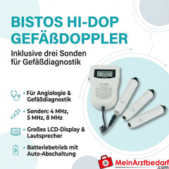 The Bistos HI-DOP vascular Doppler offers a reliable method for non-invasive vascular diagnostics. Three probes are included in the scope of delivery - with 4 MHz, 5 MHz and 8 MHz frequency - so that different measurement depths and vessel sizes can be covered.