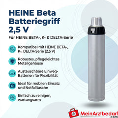 Scope of delivery: 1 Heine Beta battery handle 2.5 V (metal housing) for BETA/K/DELTA series, without batteries - Manufacturer: Heine