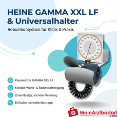 Robust universal holder for secure mounting and flexible positioning of Heine GAMMA XXL LF sphygmomanometers in clinics, medical practices and care facilities. Space-saving design for wall and floor mounting, for efficient work organisation and long-term use.
