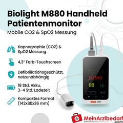 The Biolight M880 handheld patient monitor enables mobile monitoring of CO2 (in exhaled gas) and oxygen saturation (SpO2). The compact design and powerful rechargeable battery make the device ideal for mobile or stationary use in hospitals, surgeries and emergency services. The 4.3″ colour touchscreen with battery indicator ensures intuitive operation and clear display of the measured values.