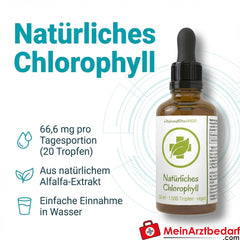 Liquid natural chlorophyll from alfalfa extract as a practical dietary supplement for everyday use. Simple dosage in drop form, ideal for stirring into water or juice.