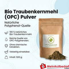 100 % natural organic grape seed flour as a rich source of OPC polyphenols. Finely ground powder for everyday nutrition, ideal for stirring into yoghurt, baked goods or salads. Produced without chemical extracting agents; natural product for use .