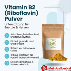 100 % pure riboflavin (vitamin B2) powder for targeted supply. Supports energy metabolism, the nervous system and the maintenance of skin and vision. Practical dosage form for stirring into water or juice, suitable for everyday use and targeted supplementation.
