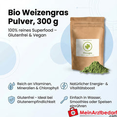 Organic wheatgrass powder, 300 g pack: finely ground green powder from certified organic cultivation. Rich in vitamins, minerals and natural chlorophyll; suitable as a daily dietary supplement for everyday life, sport and plant-based diets.