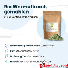 Finely ground, certified organic wormwood (Artemisia absinthium) in food quality. Aromatic, bitter herbs for making tea and as a supplement for horses and dogs. Suitable for Austria and Germany.