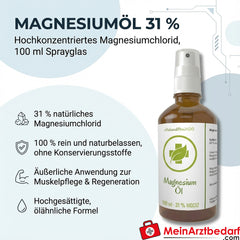 Solución altamente saturada de cloruro de magnesio en un práctico frasco de cristal con atomizador - de uso externo para el cuidado muscular, la regeneración y el bienestar general. 100% natural, sin conservantes, apto para uso diario.