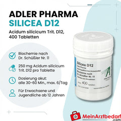 Volumen de suministro: 1 envase de Adler Pharma Silicea D12, Acidum silicicum Trit. D12, 250 mg comprimidos - Fabricante: Adler Pharma