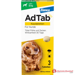 El sabroso comprimido masticable actúa durante un mes, mata rápidamente las garrapatas y las pulgas, e interrumpe el ciclo de multiplicación de las pulgas matando a la pulga antes de la puesta de huevos. El medicamento veterinario mata las pulgas ya existentes y las recién nacidas en el perro antes de que puedan poner huevos. De esta manera, interrumpe el ciclo de multiplicación de las pulgas. Los comprimidos masticables AdTab son adecuados para cachorros a partir de las 8 semanas de vida y con un peso mínimo de 1,3 kg.