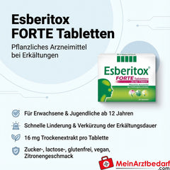 - Esberitox FORTE es un medicamento a base de plantas para el tratamiento de apoyo y la prevención de los resfriados recurrentes en el tracto respiratorio superior. Esberitox FORTE combina los principios activos vegetales árbol de la vida y coneflower para que sus propiedades positivas se complementen perfectamente y puedan desarrollar plenamente su efecto medicinal. El efecto de Esberitox Los síntomas del resfriado se alivian y mejoran eficazmente a partir del 2º día12 y la duración del resfriado se reduce hasta 3 días1. 16 mg de extracto seco de principios activos vegetales por comprimido proporcionan toda la potencia de la planta Para adultos y adolescentes a partir de 12 años. Sin azúcar, lactosa, gluten y vegano. Con un delicioso sabor a limón.