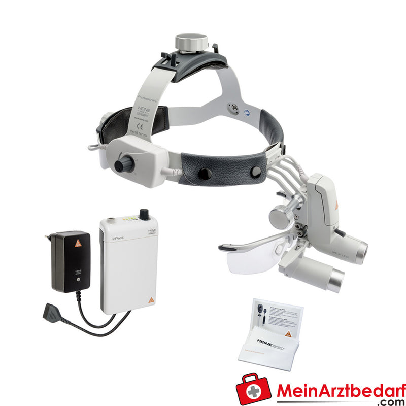 Lámpara frontal LED Heine ML4 con lupas binoculares HR/HRP 3,5× aumentos 420 mm, Kit de faros LED ML4, mPack + transformador enchufable + S-GUARD.