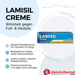 Lamisil crema es un agente antifúngico de amplio espectro que se utiliza para tratar las infecciones fúngicas de la piel. El principio activo clorhidrato de terbinafina penetra en las capas cutáneas afectadas, inhibe la reproducción de los hongos y los mata. Esta crema se utiliza para enfermedades fúngicas de la piel como el pie de atleta, infecciones fúngicas en el cuerpo, los muslos y la zona inguinal, así como para la candidiasis cutánea y la viruela.
