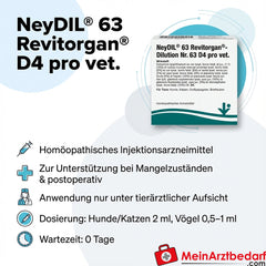 NeyDIL 63 Revitorgan D4 pro vet es un medicamento homeopático registrado para el tratamiento de apoyo de deficiencias y situaciones postoperatorias. Utilizar exclusivamente bajo supervisión veterinaria; no sustituye el diagnóstico y la terapia veterinarios.