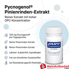 Extracto puro de corteza de pino Pycnogenol® con una alta concentración de OPC para un aporte suplementario. Cápsulas aptas para veganos, sin lactosa ni gluten, sin colorantes artificiales ni aditivos innecesarios. Para adultos para un aporte suplementario de apoyo.