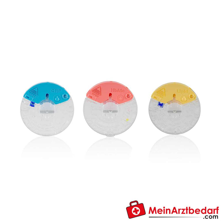 Casetes de prueba para el medidor cobas b 101 para la determinación rápida de HbA1c, perfil lipídico y proteína C reactiva (PCR). Adecuados para la toma de muestras de sangre capilar o venosa; los breves tiempos de medición permiten tomar decisiones clínicas rápidas en la consulta, el ambulatorio y el laboratorio.