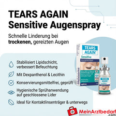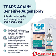 TEARS AGAIN® Sensitive Eye Spray mejora la humectación de la superficie ocular y estabiliza la capa lipídica de la película lagrimal. Sin conservantes y probado dermatológica y oftalmológicamente. Práctica aplicación en spray sobre los párpados cerrados, ideal para viajes y compatible con lentes de contacto.