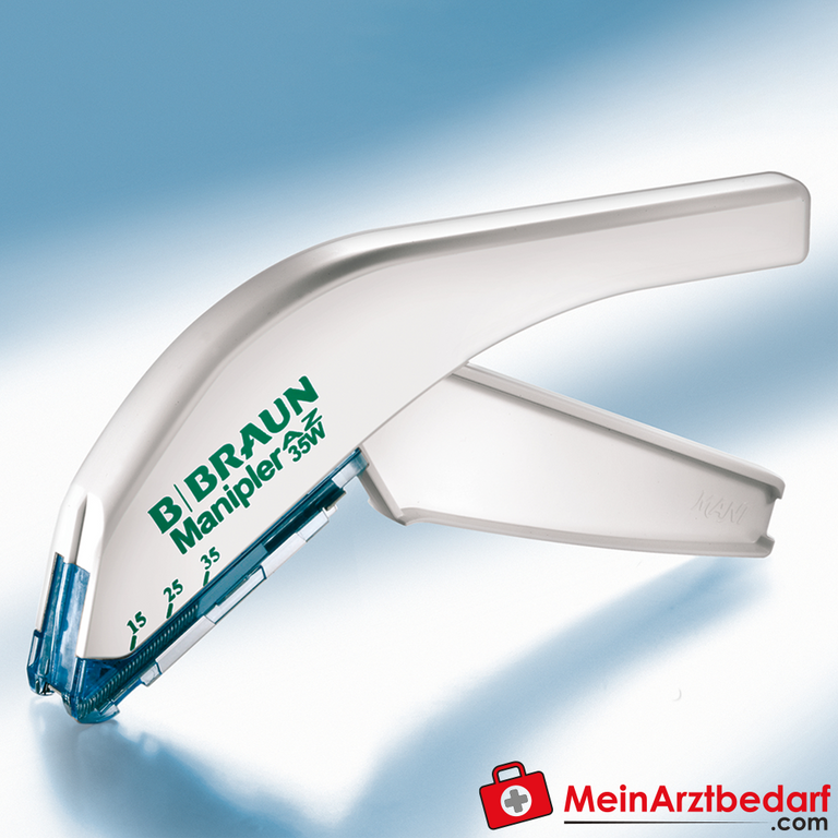 L'agrafeuse cutanée à usage unique B. Braun Manipler AZ 35W sert à fermer rapidement et en toute sécurité les plaies cutanées lors d'applications médicales et ambulatoires. Le design léger et maniable et la tête coudée de l'appareil permettent une mise en place précise avec une bonne visibilité des bords de la plaie.