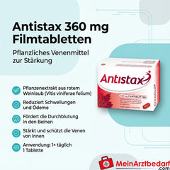 Les comprimés pelliculés Antistax 360mg contiennent une substance protectrice végétale active sur les veines, extraite de la feuille de vigne rouge. Il renforce et protège vos veines de l'intérieur en favorisant la circulation sanguine et en réduisant les gonflements. Il inhibe les inflammations, réduit la perméabilité des parois vasculaires et prévient ainsi les gonflements.