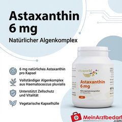 Astaxanthine 6 mg comme complément alimentaire à base de l'algue Haematococcus pour soutenir la protection cellulaire et la vitalité au quotidien. Capsules végétariennes, idéales pour une supplémentation quotidienne en Allemagne et en Autriche.