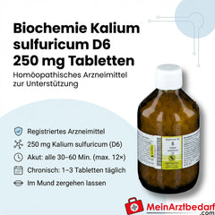 Médicament homéopathique à base de Kalium sulfuricum D6, indiqué comme traitement de soutien en cas de troubles aigus et chroniques. Comprimés à laisser fondre dans la bouche ; produit enregistré. Consulter un médecin si les symptômes persistent.