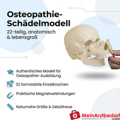 Modèle de crâne authentique, grandeur nature, spécialement conçu pour la formation en ostéopathie et l'enseignement anatomique . Adapté avec précision à l'anatomie standard sur la base d'un véritable crâne humain numérisé ; idéal pour les démonstrations, l'entraînement à l'examen et l'enseignement pratique.