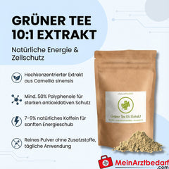 Extrait de thé vert (Camellia sinensis) hautement concentré sous forme de poudre fine pour le complément alimentaire quotidien. Combine une teneur naturelle en caféine avec une teneur élevée en polyphénols et soutient ainsi l'énergie, la concentration et la protection cellulaire antioxydante au quotidien.