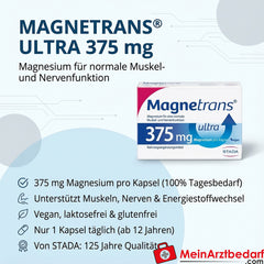 Magnetrans® 375 mg ultra est une préparation hautement dosée en magnésium pour un apport complémentaire en magnésium. Une gélule par jour couvre la valeur de référence quotidienne et soutient ainsi le fonctionnement normal des muscles et des nerfs ainsi que le métabolisme énergétique.