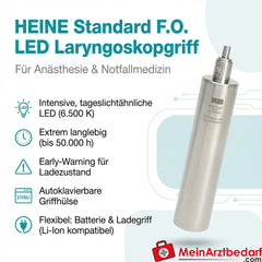 La poignée de laryngoscope HEINE Standard F.O. LED offre une solution d'éclairage durable et efficace en énergie pour le quotidien clinique et facilite l'intégration dans les instruments existants grâce à sa compatibilité et à sa maintenance simple.