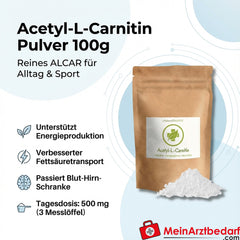 Comme complément alimentaire, prendre 500 mg d'acétyl-L-carnitine par jour (environ 3 cuillères à mesurer). Dissoudre la poudre dans une grande quantité de liquide ou la mélanger à des aliments. Ne pas dépasser la dose journalière recommandée. Ne pas utiliser comme substitut d'une alimentation équilibrée. Demander conseil à un médecin en cas de maladie existante, de grossesse ou de prise de médicaments.