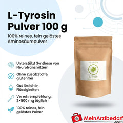 Contenu de la livraison : 1 paquet de poudre de L-tyrosine 100% pure, 100 g (poudre finement dissoute) et 1 cuillère de mesure. Fabricant : Vitalundfitmit100
