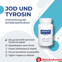Complément alimentaire purement formulé avec de l'iode et de la tyrosine pour soutenir la fonction thyroïdienne normale et le métabolisme énergétique. Par gélule, 500 mg de tyrosine et 225 µg d'iode pour un apport nutritionnel ciblé lors d'une utilisation quotidienne.