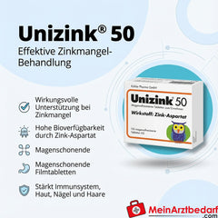 Unizink® 50 est un moyen efficace de traiter les carences en zinc qui ne peuvent pas être corrigées par l'alimentation. Le zinc est un oligo-élément essentiel qui soutient de nombreuses fonctions corporelles, y compris le renforcement du système immunitaire. Les signes d'une carence en zinc peuvent être un système immunitaire faible, des problèmes de peau, des ongles cassants, de la fatigue, des problèmes de sommeil et une perte de cheveux. Unizink® 50 contient un dosage optimal de zinc, de sorte qu'un comprimé pelliculé par jour est généralement suffisant pour prévenir une carence en zinc. Le composé organique zinc-aspartate assure une biodisponibilité élevée et une bonne tolérance.