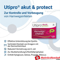 Utipro akut & protect contribue au contrôle et à la prévention des infections urinaires non compliquées (cystites). La formule combinée agit physiquement dans l'intestin et réduit la transmission de germes à Gram négatif, comme Escherichia coli, dans les voies urinaires.