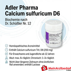Adler Pharma Calcium sulfuricum D6 è un medicinale omeopatico registrato secondo la biochimica del dottor Schuessler (n. 12) con il principio attivo Calcium sulfuricum Trit. D6. Il preparato è indicato per un uso di supporto nei campi di applicazione generali dei medicinali omeopatici; in caso di disturbi persistenti, poco chiari o nuovi, è necessario consultare un medico.