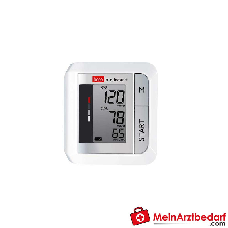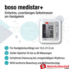 Boso medistar+ è un misuratore di pressione da polso compatto per la misurazione indipendente a casa. È adatto a circonferenze del polso di 13,5-21,5 cm e memorizza i risultati delle misurazioni per un monitoraggio a lungo termine.