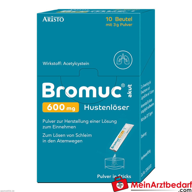 Contenuto della fornitura: 10 bustine di Bromuc acuto 600 mg in granuli da sciogliere.