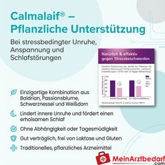 Le compresse di Calmalaif® contengono una combinazione di valeriana, passiflora, ortica nera e biancospino e sono utilizzate in caso di irrequietezza interiore dovuta allo stress, tensione e difficoltà ad addormentarsi. La medicina tradizionale a base di erbe è utilizzata per sostenere la rigenerazione dell'organismo senza dipendenza nota o stanchezza diurna pronunciata.