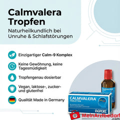 Le gocce Calmvalera sono un medicinale omeopatico di supporto ai disturbi nervosi come l'irrequietezza interiore e i disturbi del sonno. Le gocce contengono il complesso Calm-9 di nove principi attivi omeopatici e possono essere dosate con precisione. Nessuna assuefazione, nessuna sonnolenza diurna pronunciata; vegano e privo di lattosio, zucchero e glutine.