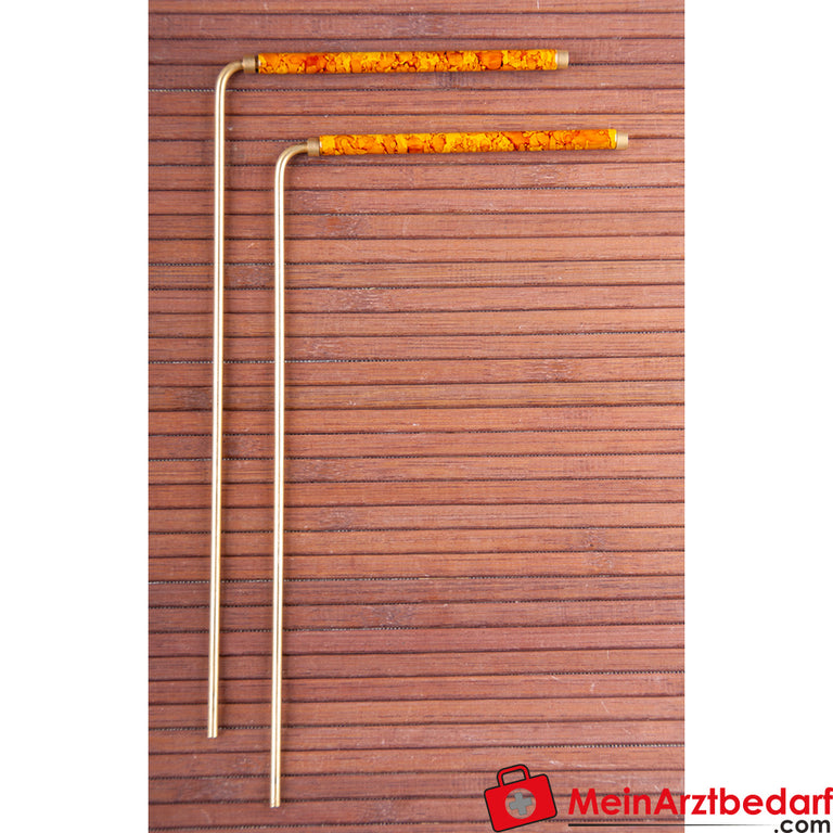 Queste bacchette da radiestesia sono fornite in coppia e hanno una lunghezza di 21 cm. Sono realizzate in oro giallo di alta qualità e con un manico in rame.