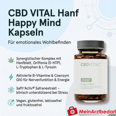 Contenuto della confezione: 60 capsule CBD VITAL Hemp Happy Mind con Griffonia (5-HTP) (vegan) - Produttore: Vitrasan GmbH